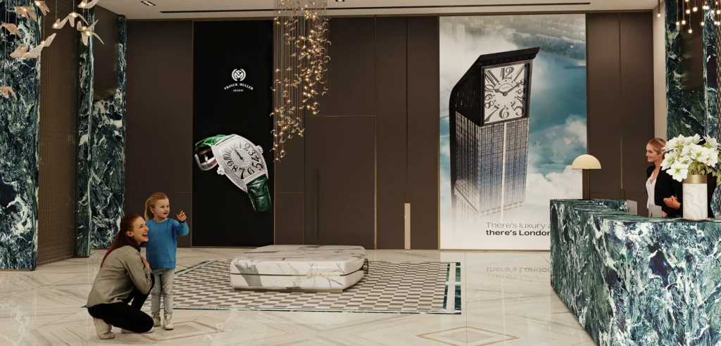 Franck Muller Aeternitas by London Gate offers an array of high-end amenities that elevate luxury living in Dubai Marina. Residents can enjoy a host of recreational and relaxation options, including a Zen garden for a peaceful retreat, a private cinema for entertainment, and a London-inspired cigar lounge. Sports and wellness amenities are abundant, with facilities such as “The London Gym,” a yoga studio, a swimming pool, and dedicated sports courts. For added leisure, there’s a billiards room, a party hall, and a children’s play area, creating a community atmosphere suitable for all ages.