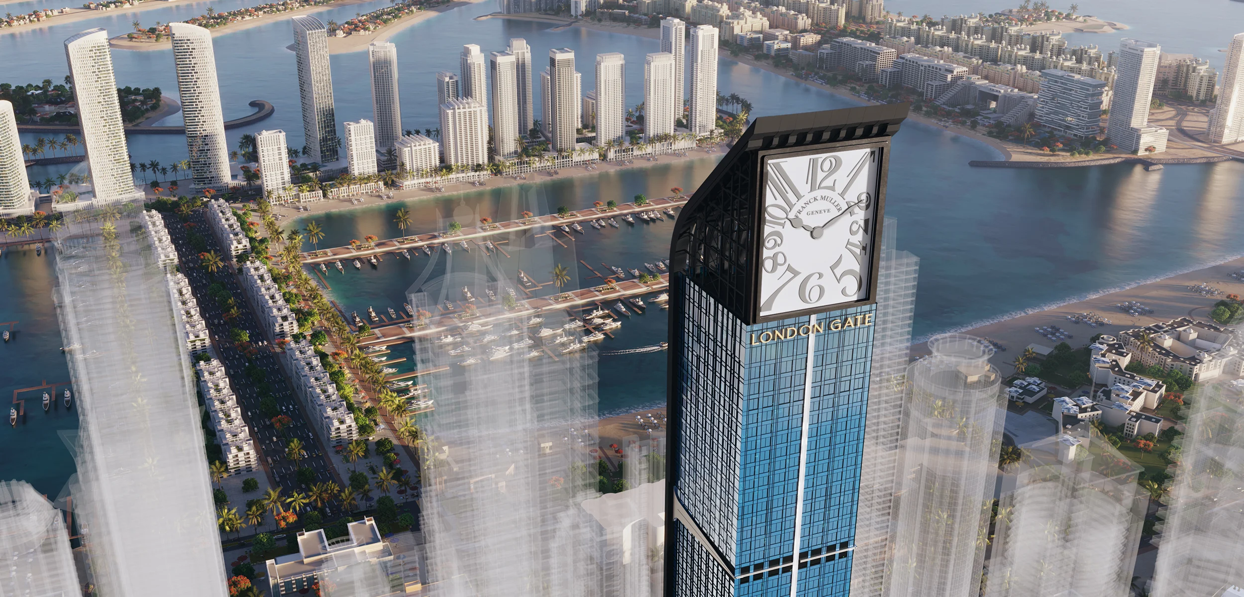 The masterplan of Franck Muller Aeternitas by London Gate in Dubai Marina presents a vision of luxury living that combines innovative design with the elegance associated with Franck Muller. Rising to 450 meters, this unique clock tower is the world’s tallest residential structure of its kind, inspired by the intricacies of Franck Muller’s most complex watch. The development offers a harmonious blend of upscale residences, ranging from spacious apartments to villas and mansions. Carefully designed to provide a serene living experience, the masterplan includes lush gardens, open green spaces, and amenities that foster a sense of community and exclusivity.